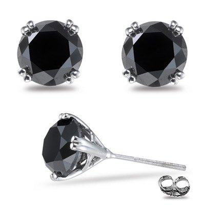These classy Black Diamond Stud Earrings exhibit one solitaire black diamond each in 18K White Gold. Approximate Black Diamond Weight: 4.00 Carats. Ideal earrings to enhance your aura. ,METAL:18K Gold,ACTUAL METAL:18K White Gold,RHODIUM:Yes,BACKING:Screw Backs,HEIGHT:0.35 in,WIDTH:0.35 in,NUMBER OF DIAMONDS:2,SHAPE:Round,DIMENSION:7.00-7.40 mm,AVERAGE COLOR:Black,AVERAGE QUALITY:AA,MINIMUM CARAT TOTAL WEIGHT:4.00,SETTING STYLE:Prong Setting,COLOR:Black,GENDER:Womens,PRODUCT TYPE:Stud Earrings,MATERIAL:Color Diamond {DIAMOND APPRAISAL INCLUDED}